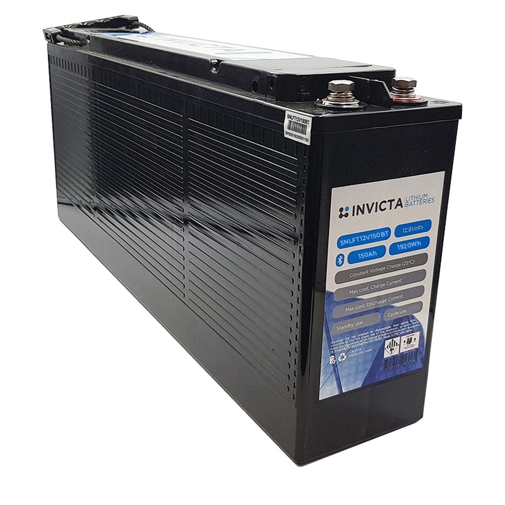Invicta 12V 150Ah Front Terminal Lithium Battery with Bluetooth, 7 Year Warranty. Invicta lithium is designed to the highest specifications to deliver a premium solution that has been proven to perform. Consisting of high-grade aluminium LiFePO4 prismatic cells, solid busbar connectors and an integrated BMS, Invicta lithium is a reliable and robust lithium battery for those that need complete confidence in their system.