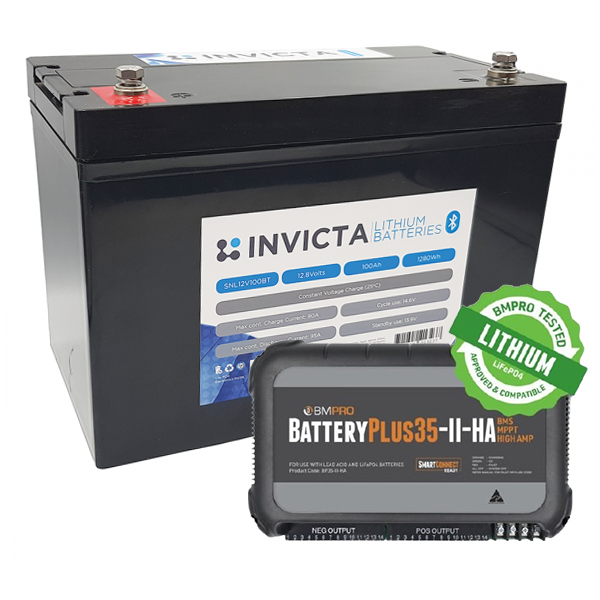 Invicta 12V 200Ah Lithium Battery with Bluetooth + BMPRO BatteryPlus35-II-HA 35A High Amp Battery Management System Bundle
