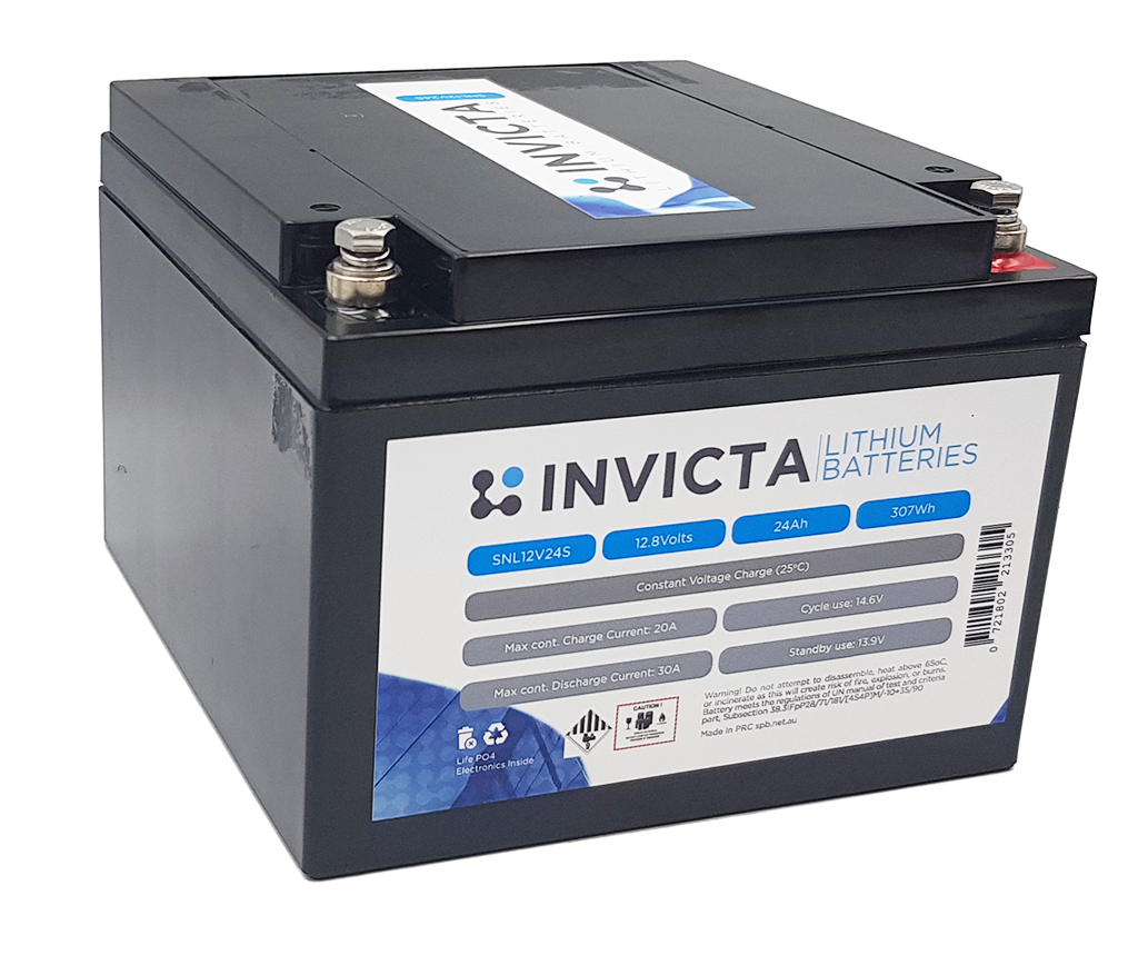 Invicta 12V 24Ah Lithium Battery with 4 Series Functionality, 7 year warranty. The Invicta Lithium 12V range has been specifically designed for replacement of similar size Lead acid batteries. The family is comprised of the popular sizes found in the lead acid range but with the added benefits of Lithium Iron Phosphate (LiFePO4) technology and is ideally suited to deep cycle longer run time applications.
