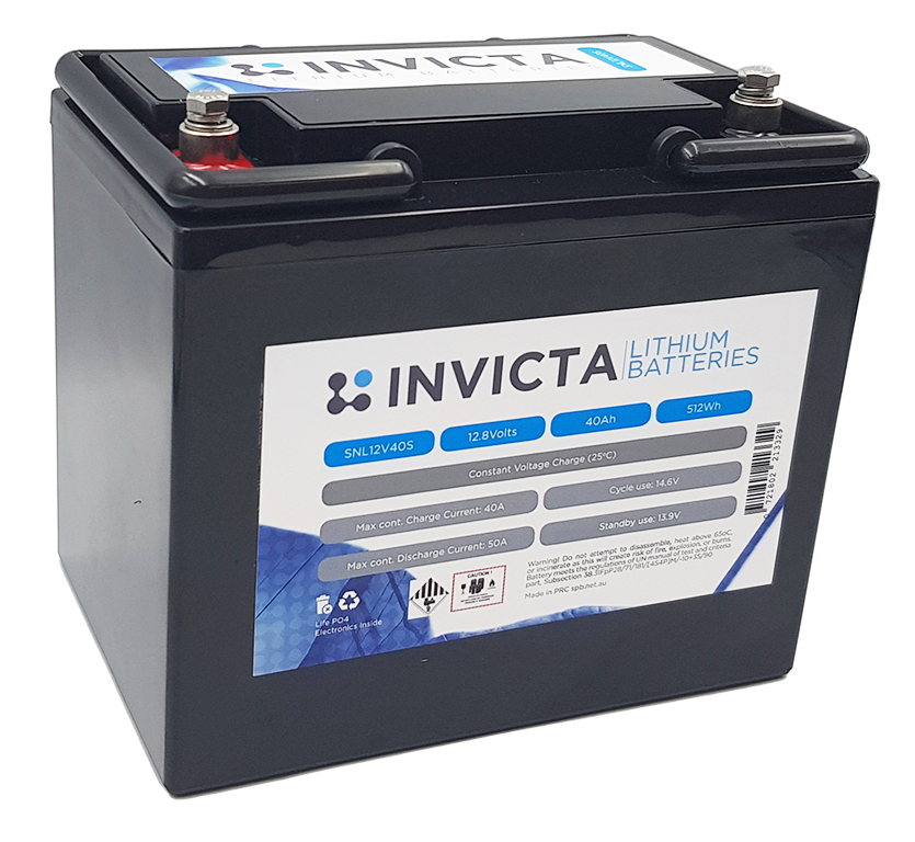 Invicta 12V 40Ah Lithium Battery with 4 Series Functionality, 7 year warranty. The Invicta Lithium 12V range has been specifically designed for replacement of similar size Lead acid batteries. The family is comprised of the popular sizes found in the lead acid range but with the added benefits of Lithium Iron Phosphate (LiFePO4) technology and is ideally suited to deep cycle longer run time applications.