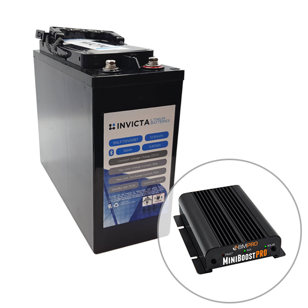 Invicta 12V 50Ah Front Terminal Lithium Battery with Bluetooth + BMPRO 30Ah 12V DC to DC Battery Charger with Solar Input, 7 Year Warranty.