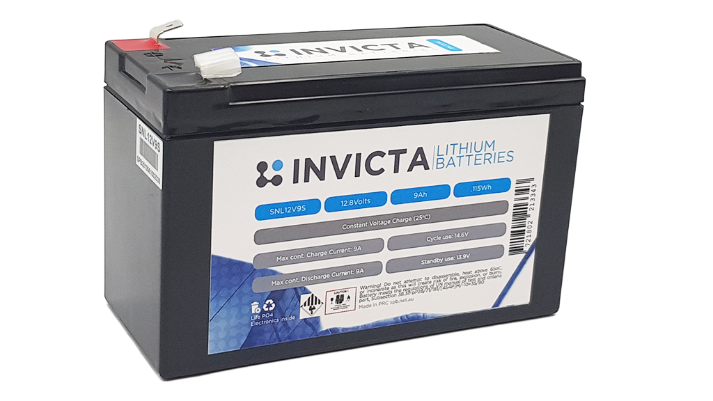 Invicta 12V 9Ah Lithium Battery with 4 Series Functionality, 7 year warranty. The Invicta Lithium 12V range has been specifically designed for replacement of similar size Lead acid batteries. The family is comprised of the popular sizes found in the lead acid range but with the added benefits of Lithium Iron Phosphate (LiFePO4) technology and is ideally suited to deep cycle longer run time applications.