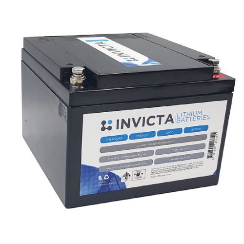 Invicta 24V 12Ah Lithium Battery with 4 Series Functionality, 7 Year Warranty. Invicta lithium batteries are available in over 20 12V, 24V and 36V sizes that consist of aluminum encased prismatic cells which have been bolted together using solid busbar connectors. These have been further reinforced with a strengthening frame to resist damaging vibrations.
