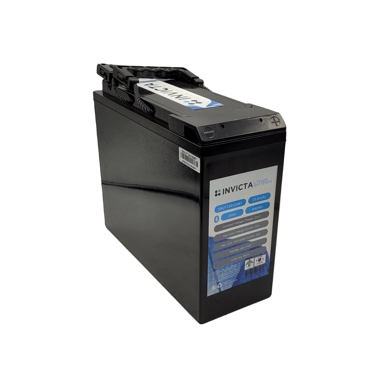 Invicta 24V 25Ah Lithium Battery with Bluetooth, 7 Year Warranty. The Invicta Lithium 24V range has been specifically designed for replacement of similar size Lead acid batteries. The family is comprised of the popular sizes found in the lead acid range but with the added benefits of Lithium Iron Phosphate (LiFePO4) technology and is ideally suited to deep cycle longer run time applications.
