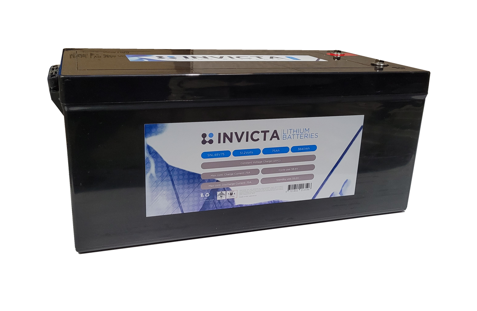 Invicta 48V 75Ah Lithium Battery with 4 Parallel Functionality, 7 Year Warranty. The Invicta Lithium 12V range has been specifically designed for replacement of similar size Lead acid batteries. The family is comprised of the popular sizes found in the lead acid range but with the added benefits of Lithium Iron Phosphate (LiFePO4) technology and is ideally suited to deep cycle longer run time applications.
