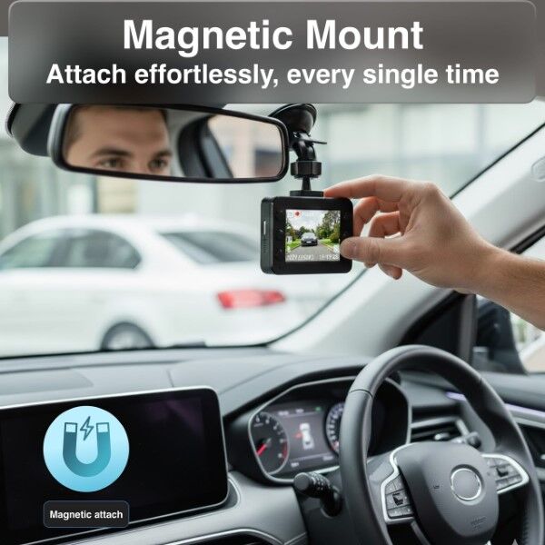 The magnetic mount clicks the dashcam into place in seconds no tools, no fuss.Remove it just as easily when you need to switch cars or adjust positioning. Clean. Seamless. Effortless.