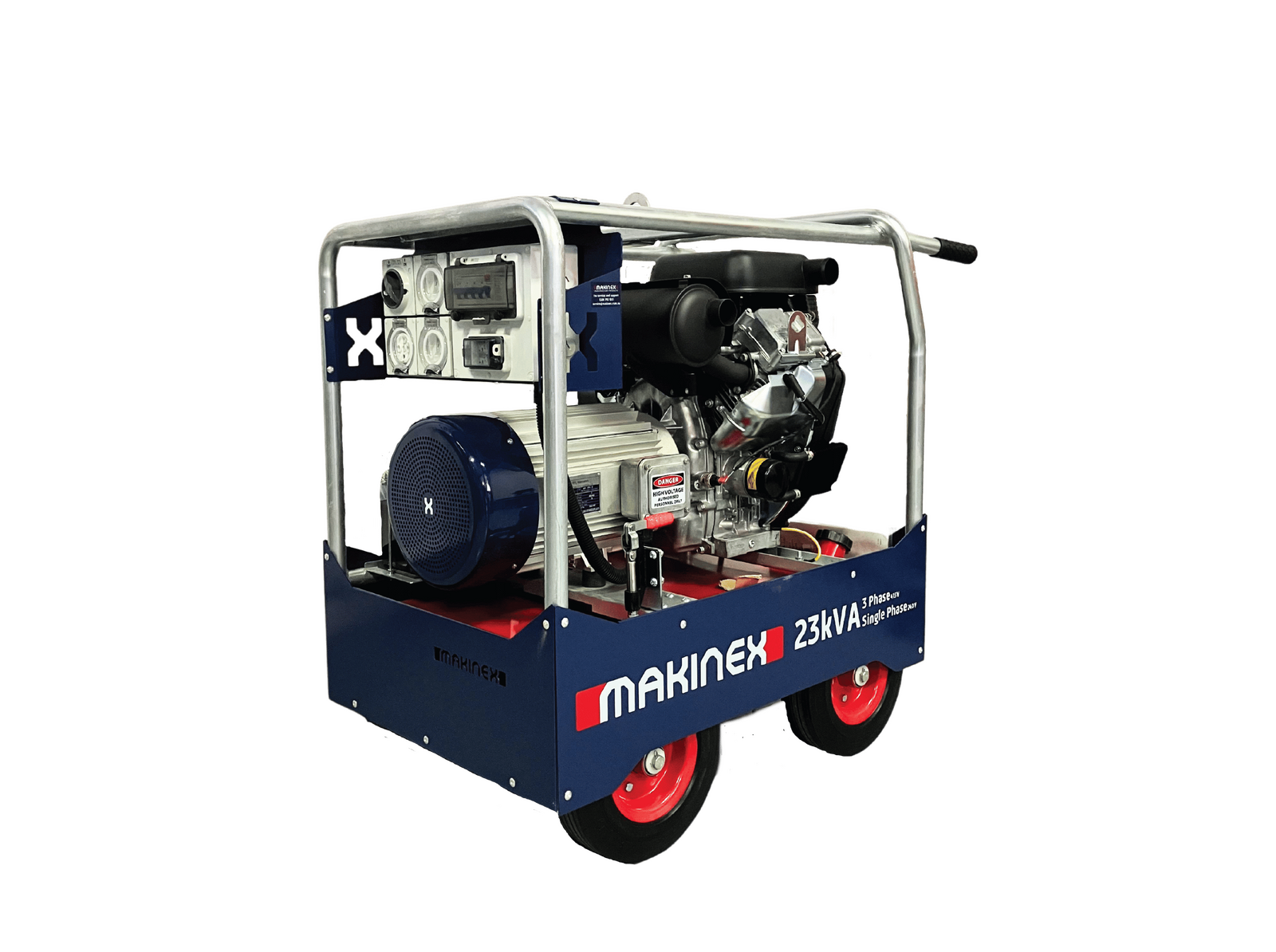 Makinex 3 Phase 23 kVA Petrol Generator, 1 Year Warranty. Less than one third the size and weight of comparable towable and SKID generators, the 23kVA is the world’s smallest 3-phase 415V generator in its class. This is a game-changer for power-hungry contractors and tradesmen in the concrete, masonry and flooring industry.