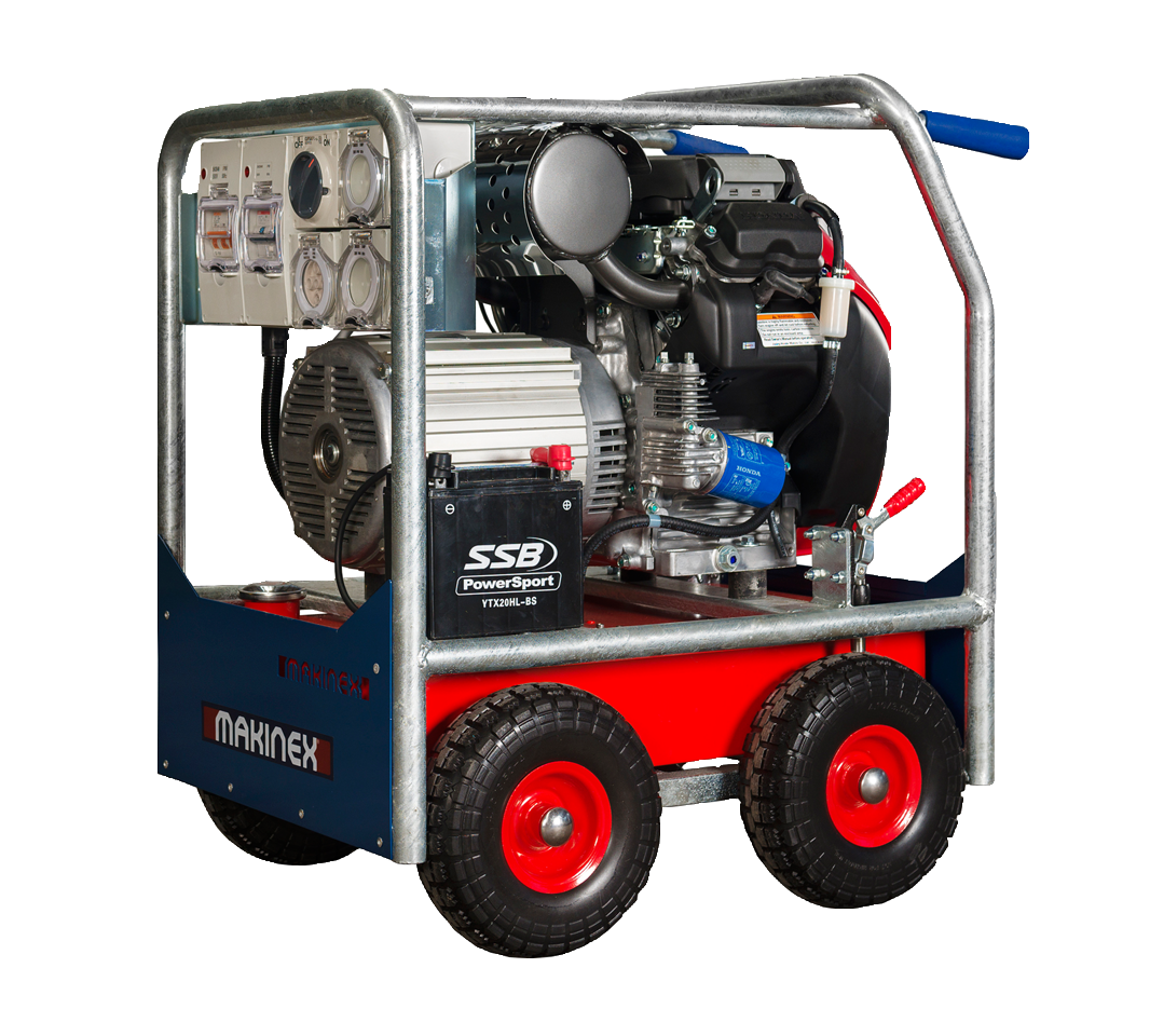 Makinex Honda Dual Phase 16 kVA Petrol Generator with Electric Start, 1 Year Warranty. The 16kVA 240/415V generator is a compact, highly portable solution for powering any combination single phase 240V tools and 415V three phase tools such as floor grinding, welders, air compressors, brick saws, and for other power applications in the flooring and construction industries.