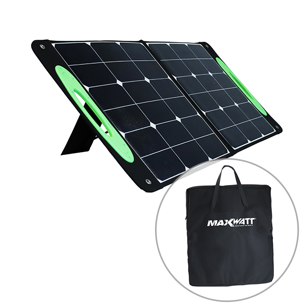 Maxwatt 100W Folding Solar Blanket with Carry Bag, 2 Year Warranty. Maxwatt 100W Monocrystalline Solar Panel, stay charged with the power of the sun! With a high conversion efficiency up to 23.7%, it's ideally suited for outdoor life and even unexpected power outages. The solar panel weighs only 3.96 kgs, it's lightweight, foldable and with an easy-carry handle, making it more portable. The Maxwatt 100-Watt Solar panel has 2 stands that can be placed firmly on any surface ground. With just a few seconds of setup, you can start charging your power station with the energy from the sun. This solar panel is compatible with all Maxwatt Power Stations and perfect for off-grid camping and unexpected power outages.