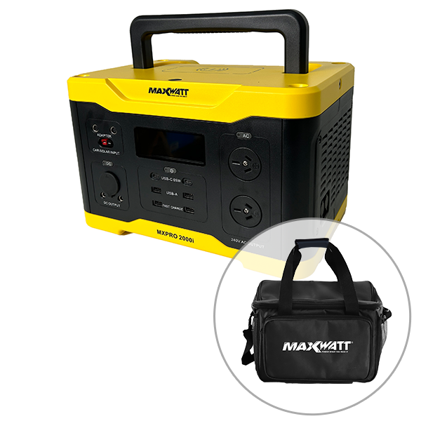 Maxwatt 1019Wh Pro Series Portable Power Station with Carry Bag, 2 Year Warranty. The Maxwatt MXPRO2000I is a compact portable Power Station that is built for taking your adventure into the great outdoors. The MXPR02000I offers a 1019Wh capacity and 1000W rated wattage, and a 2000-watt surge wattage which is an ideal power station for camping, fishing, home use, and more. The stable Lithium Ternary battery (Lithium Ion NMC) and the professional Battery Management System (BMS) that offers eight layers of protection, ensures battery life to maximum life cycles. MXPRO2000I utilizes two 65-watt PD outlet ports, which enables super-fast charging for Type-C port electronic devices. Advanced MPPT technology ensures faster solar recharge rates. With a maximum input of 400W, this power station can be fully recharged in 3.5-4 hours with 2 x Maxwatt 200-Watt Solar Panels connected in parallel. It can also be fully recharged from an AC wall outlet in 2.5 hours to 80% charge and 3 hours to 100%.
