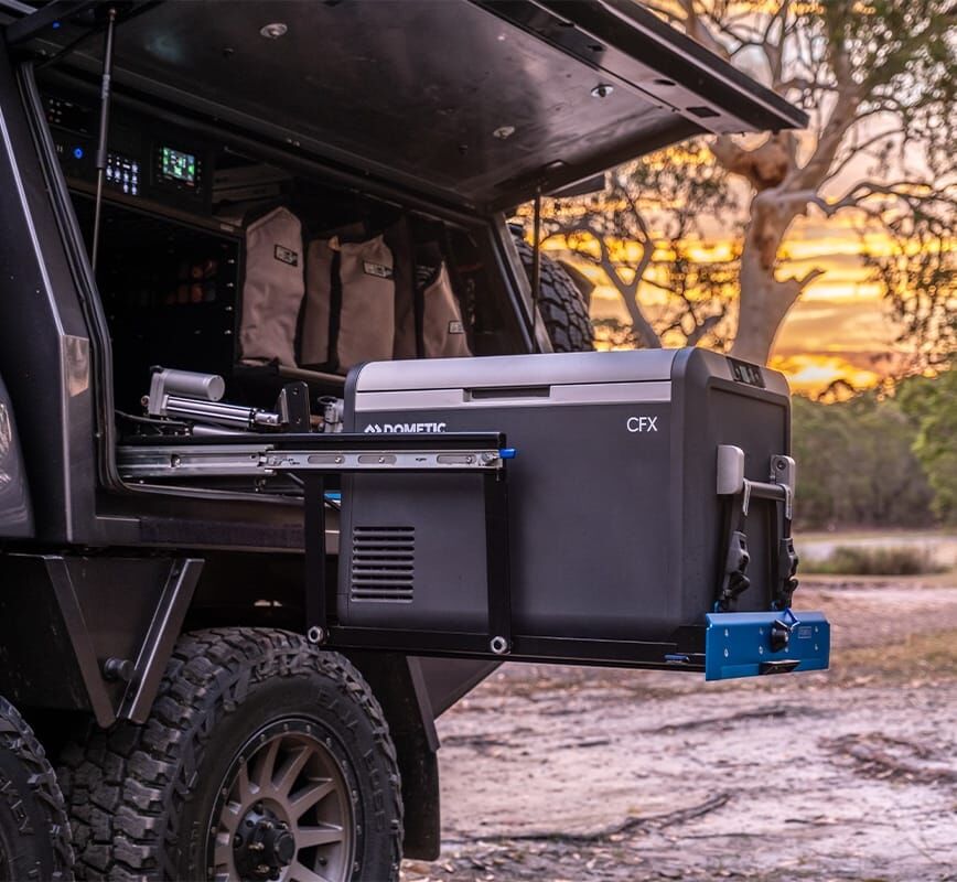 Chest style fridges and freezers offer the best solution to store refrigerated goods whilst travelling Australia’s rough roads. Accessing chilled food and drinks needs to be as easy as possible. All physical effort to raise and lower a fridge to an accessible height has been removed. Simply extend the slide and press the right-hand side control panel buttons to lower and raise the fridge. The function is smooth and effortless with the powerful twin 12-volt electric actuators doing all the work. The MSA POWER SLIDE™ shares the same compact footprint as the original patented Drop Slide™. Pre-drilled holes in the tray provide extra convenience in accommodating most popular fridges. It comes with an easily attached, emergency handle to manually raise and lower the slide in case of an electrical failure. Built extremely tough and comes with a Lifetime Guarantee on the slide and 3 Year Warranty on the actuators.
