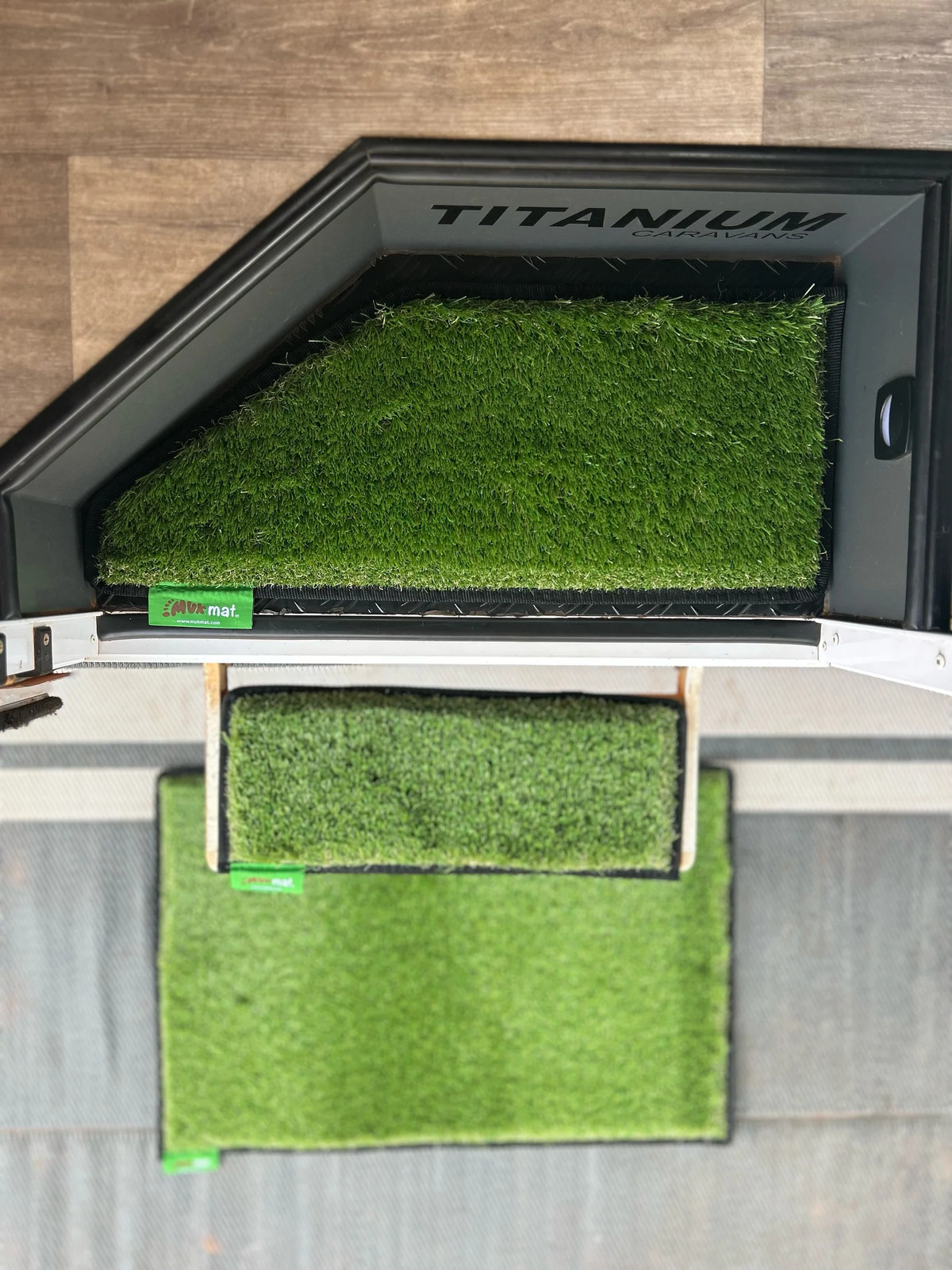Muk Mat Green Angled Caravan Step Mat, 28 x 61cm,2 Year Warranty. The muk mat Angled Caravan Step in Green is specifically designed to fit on the inner step of your caravan so you can wipe the muk straight from your feet before stepping inside.
