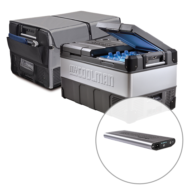 myCOOLMAN Adventurer 85 Litre Dual Zone Portable Fridge Freezer with Cover + 15Ah Power Pack Bundle, 5 Year Warranty.