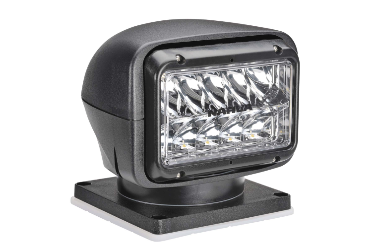 Narva 12V 5000 Lumens LED Search Lamp with Remote Control, 1 Year Warranty. Featuring dual speed control allowing a fast beam adjustment to sweep an area or a slow speed for more precise search & beam focus. This powerful 50W lamp utilises advanced optics to capture and project the light in a strong penetrating beam. Its compact size allows fitment to applications where space is limited & a strong ASA plastic resin housing ensures total weather UV & salt resistance making it the ideal option for marine security or general work lamp requirements.