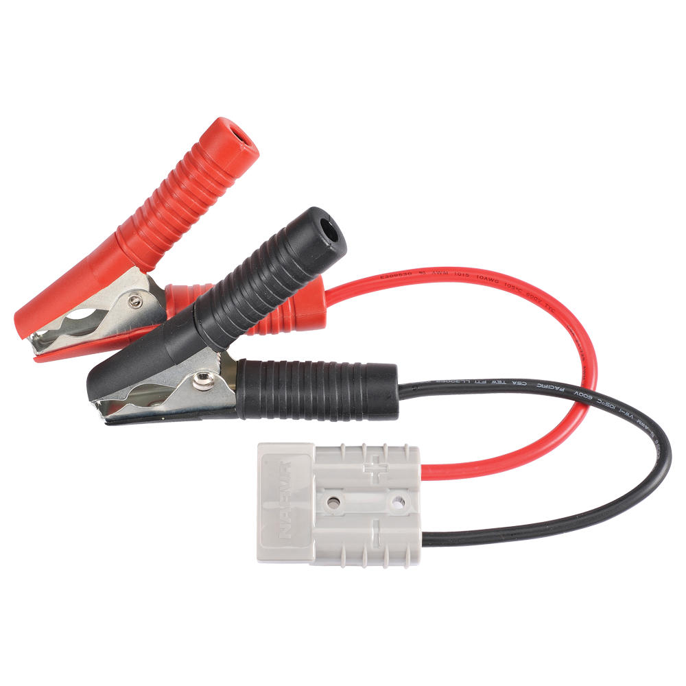 Narva 200mm Heavy-Duty Battery Clips to Battery Connector, 1 Year Warranty.  Ideal for powering appliances with a 50A battery connector directly from a battery.