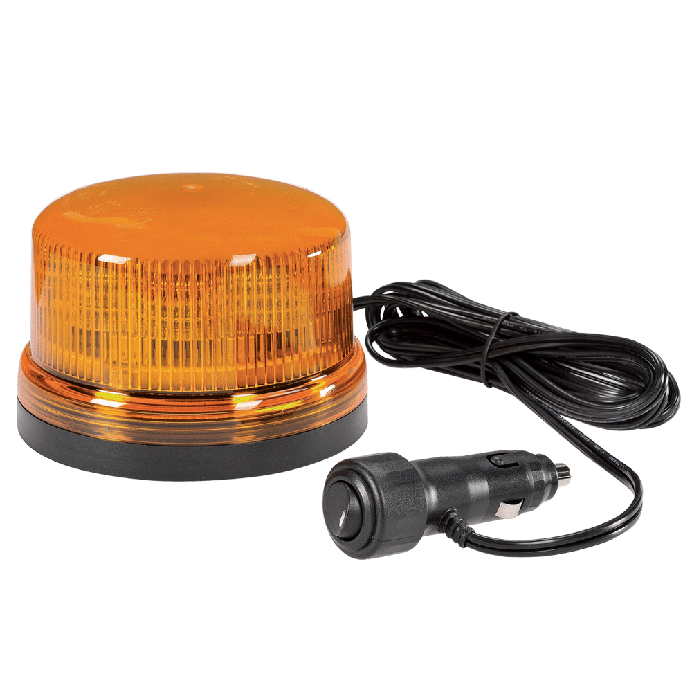 Narva Amber 'Eurotech' Low Profile LED Strobe/Rotator Light, 6 Selectable Flash Patterns, Black Base, 1 Year Warranty. Dual voltage circuitry, polycarbonate lens, vibration resistant, solid state circuitry & fully sealed to IP65, SAE Class 1 light output, reverse polarity protected. Magnetic base includes a rubber pad and 3m straight lead with cigarette lighter plug and Off/On switch.