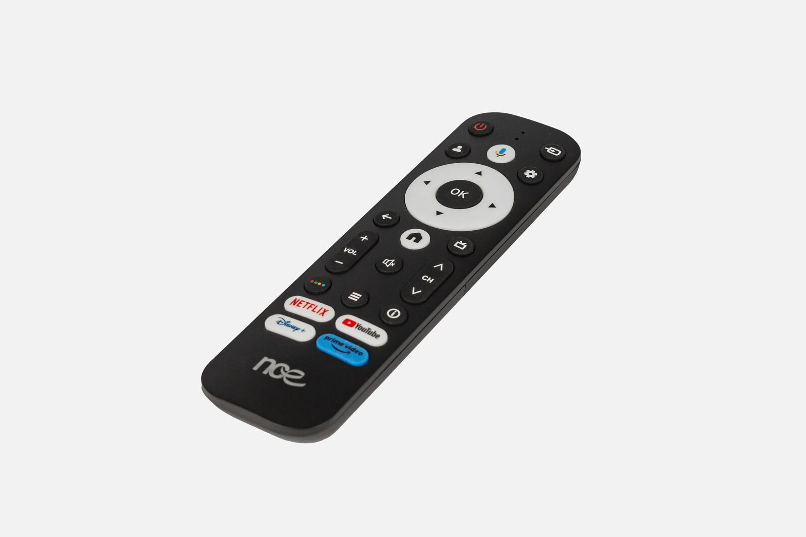 Yes, it comes with a remote featuring Google TV navigation and voice command support.