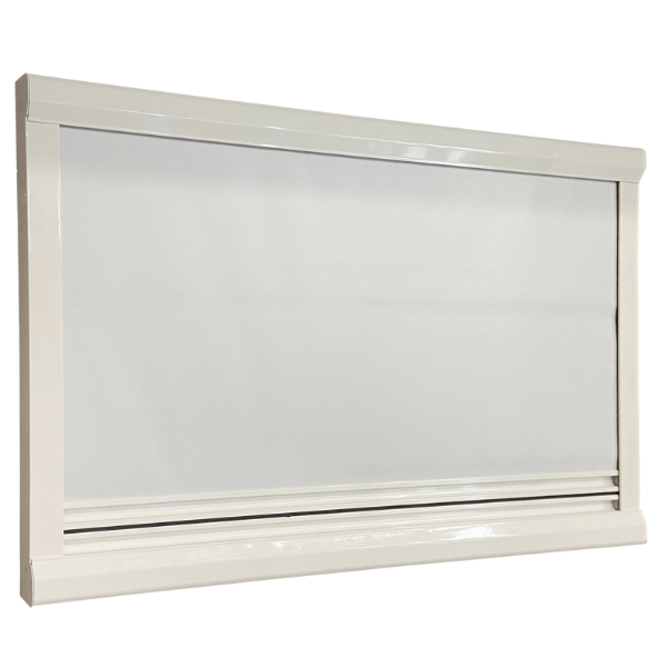 NCE Nuovo Roller Blinds, 1 Year Warranty. The interior roller blind and flyscreen unit feature a thin, non-intrusive frame design to complement any caravan or motor home design. Fitted with a pleated style blind and flyscreen, the aluminum powder-coated grab rails with magnetic strip hold allow 3 versatile window positions open, ventilation, and closed. The interior roller blind and flyscreen fit directly into the window frame providing easy and secure installation onto the caravan wall.