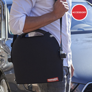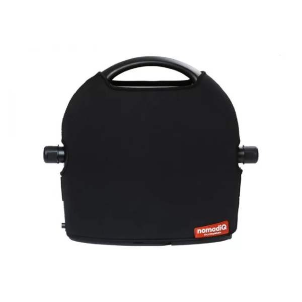 NomadiQ Black Pouch, 2 Year Warranty. The nomadiQ Protection Pouch Limited Editions are made of neoprene, making it strong and durable, while also soft and lightweight. It covers your nomadiQ BBQ while moving through the great Australian outdoors. The strap on the back allows you to store drip trays and the regulator.