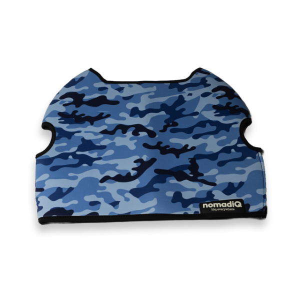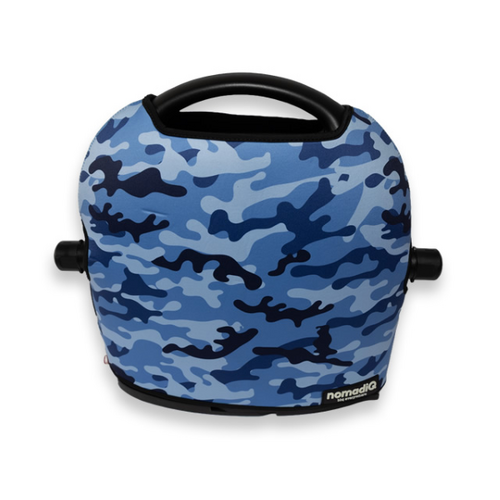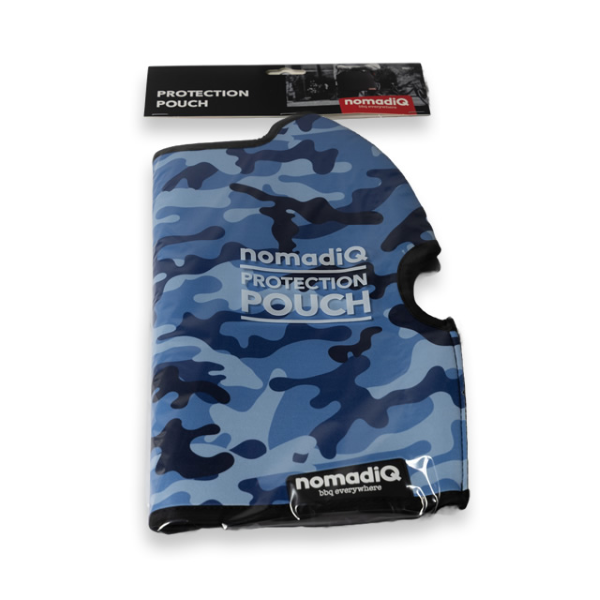 NomadiQ Marine Camo Pouch, 2 Year Warranty. The nomadiQ Protection Pouch Limited Editions are made of neoprene, making it strong and durable, while also soft and lightweight. It covers your nomadiQ BBQ while moving through the great Australian outdoors. The strap on the back allows you to store drip trays and the regulator.