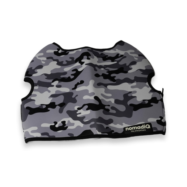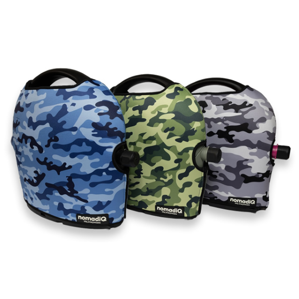 NomadiQ Urban Camo Pouch, 2 Year Warranty. The nomadiQ Protection Pouch Limited Editions are made of neoprene, making it strong and durable, while also soft and lightweight. It covers your nomadiQ BBQ while moving through the great Australian outdoors. The strap on the back allows you to store drip trays and the regulator.
