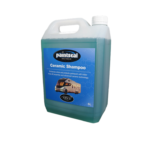 Paintseal Ceramic Shampoo, 5 Litre, 1 Year Warranty. For larger cleaning jobs, this 5L Ceramic Shampoo provides the same ceramic-enhanced formula, offering long-term protection and a hydrophobic finish. Perfect for caravans and motorhomes, this solution ensures a deep clean, leaving a smooth, glossy surface that repels dirt and water.