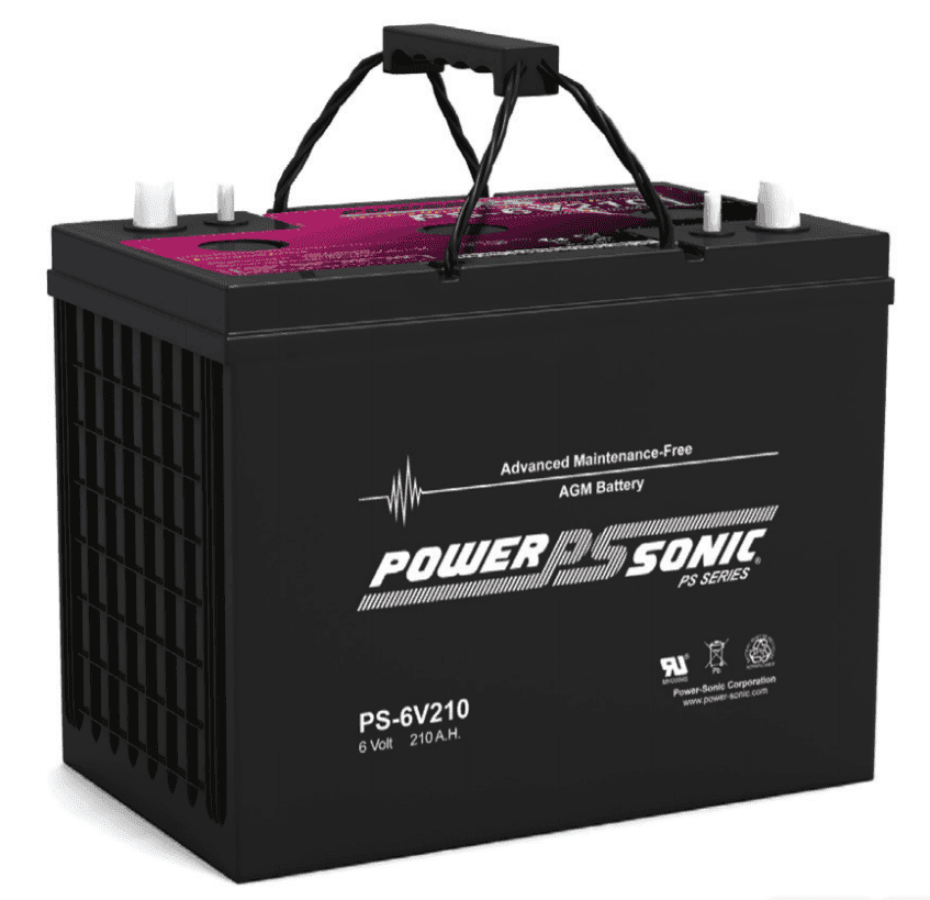 Power-Sonic 6V 210Ah AGM Deep Cycle Battery, 18 Months Warranty. The Power-Sonic range of AGM VRLA batteries are manufactured with Absorbent Glass Mat (AGM) technology for superior performance allowing greater cyclic performance, enhanced overcharge endurance and excellent recovery form over discharge situations. The lower acid density and increased electrolyte volume, along with the greater distance between plates help keep the battery at lower temperatures.
