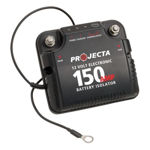 Projecta 150A Battery Isolator, 2 Year Warranty. This battery isolator is an advanced electronic isolator that suits fitment to larger 4WD vehicles, including Landcruisers, Patrols or similar, that will run powerful accessories such as fridges, lights and inverters.Â