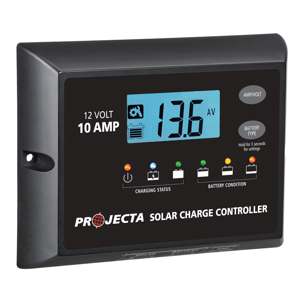Projecta Automatic 12V 10A 4 Stage Solar Charge Controller, 1 Year Warranty. Packed with features, this sophisticated solar controller is ideal for panels capable of producing up to 10 Amps. Delivering a comprehensive 4 stage charging process and the ability to tailor its settings to best suit your battery type.