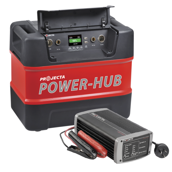 Projecta PH125 12V Portable Power-Hub & IC1000 12V Automatic 10A 7 Stage Battery Charger Pack, 1 Year Warranty.