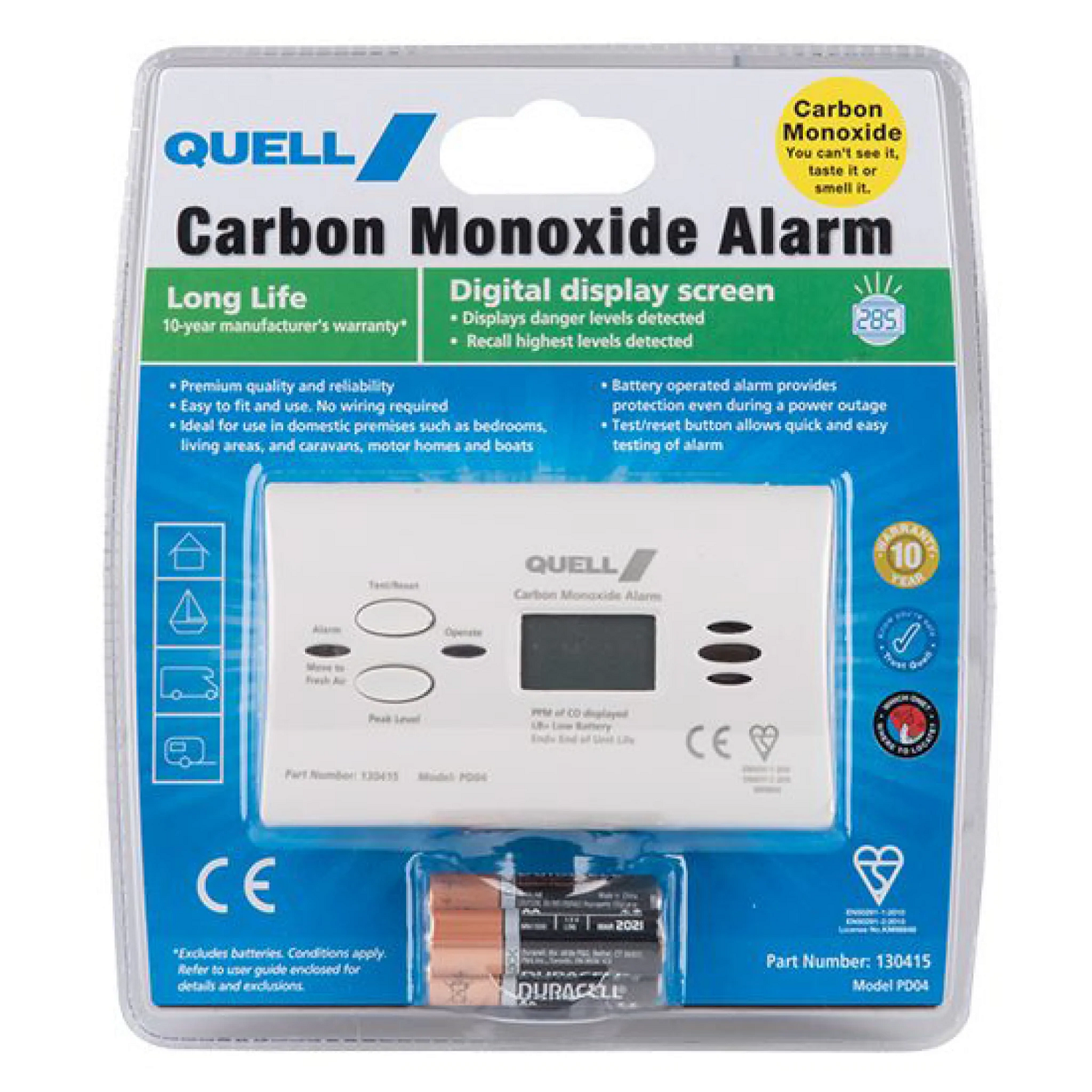 Quell Carbon Monoxide Alarm, 1 Year Warranty. Carbon monoxide (CO) alarms detect the early presence of carbon monoxide emitted from gas sources such as heating and cooking systems, vehicle engines, fuels and blocked chimneys. This alarm is easy to fit, no wiring required and can be installed anywhere – not specific to kitchens.