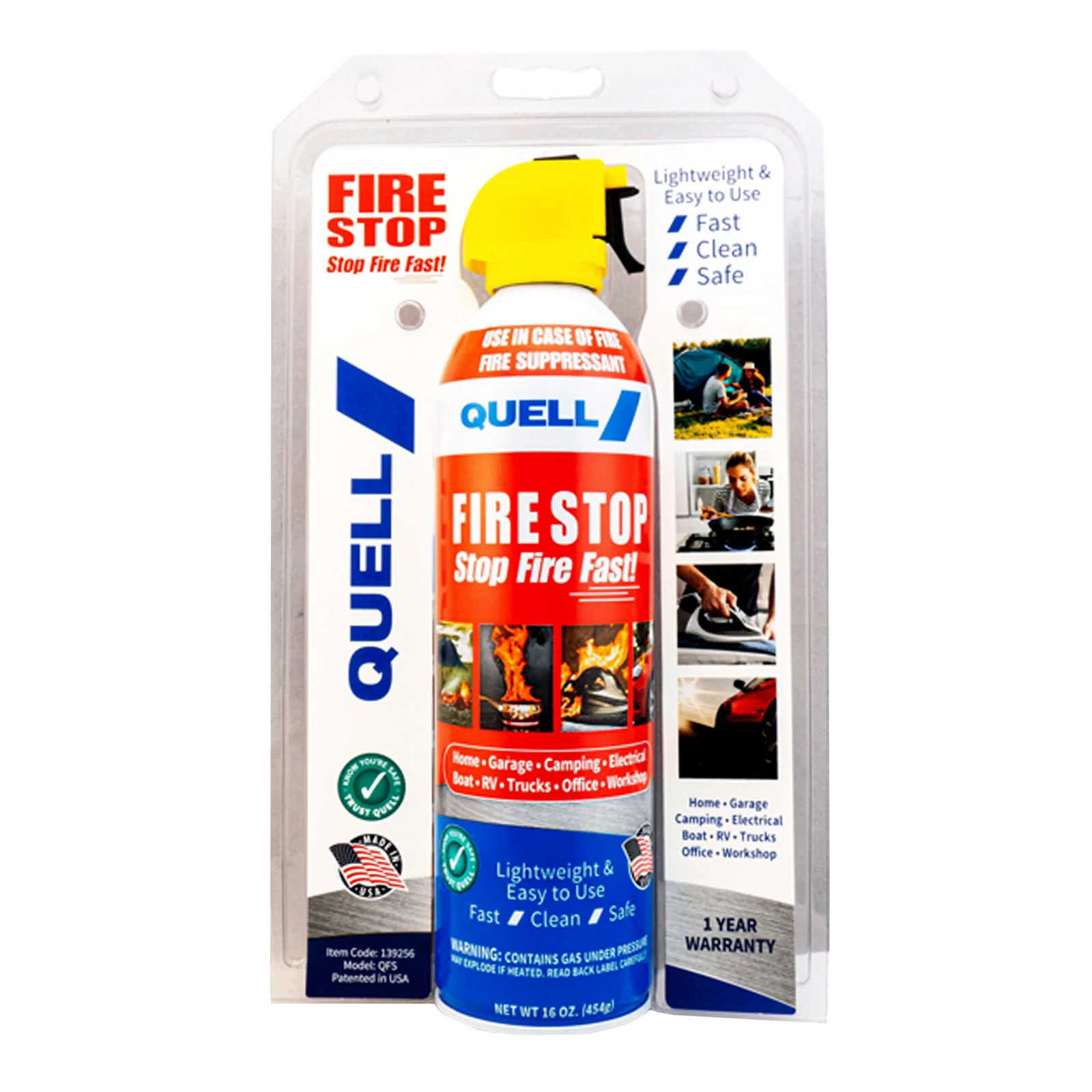Quell Fire Stop, 1 Year Warranty. Quell Fire Stop is a lightweight and easy to use fire suppressant that is suitable for single use against various fire categories. Its compact design makes it ideal for use in cars, caravans, or at home in the kitchen and garage. It is a necessity to have on board for your next camping or on road adventure.