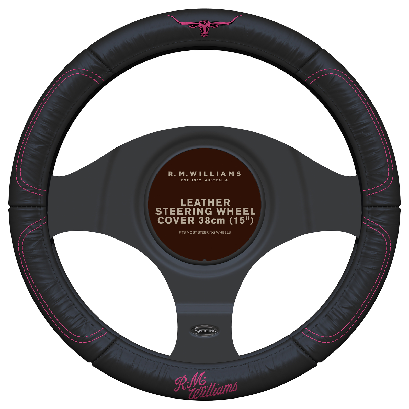 R.M. Williams Black / Pink Leather Steering Wheel Cover, 1 Year Warranty