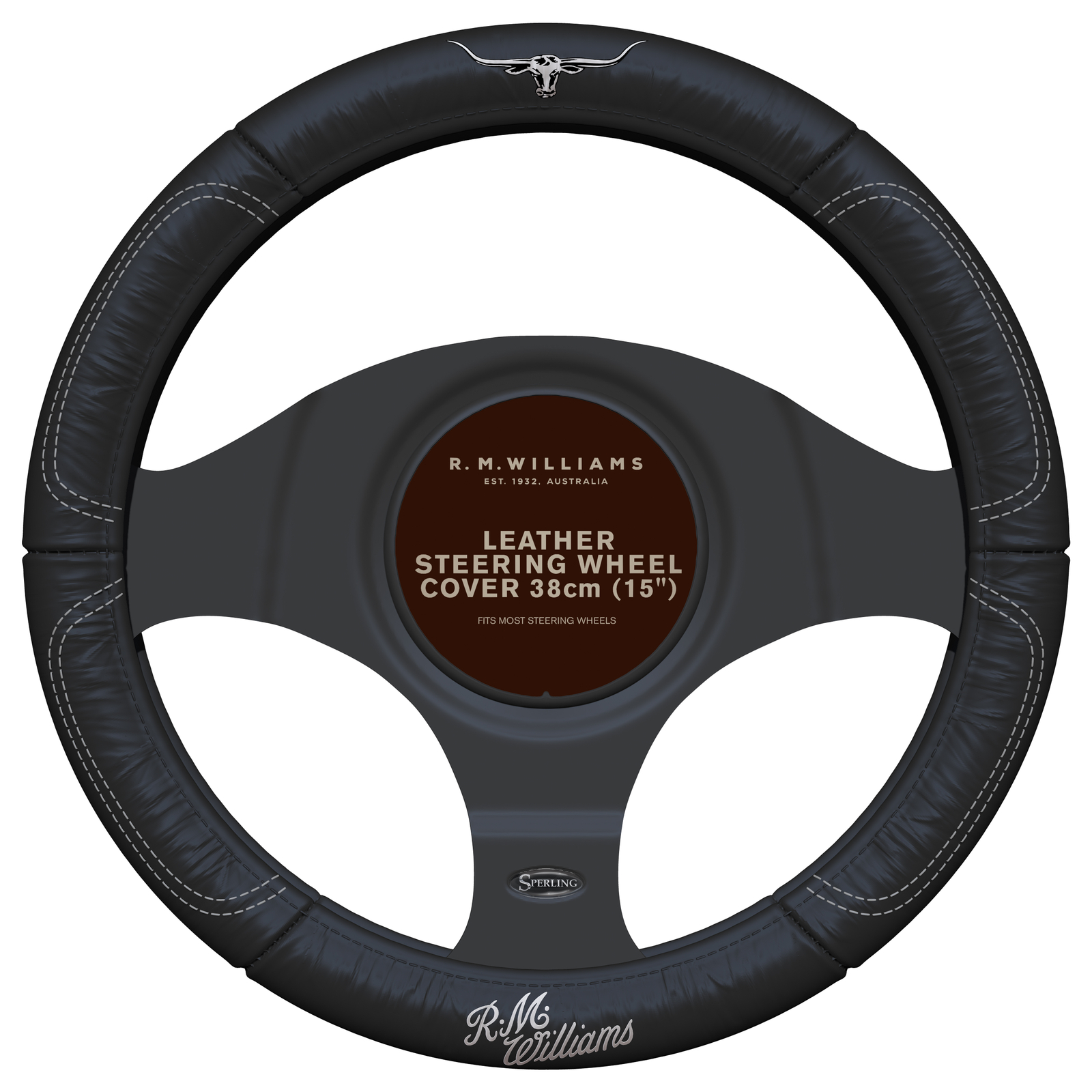 R.M. Williams Black / White Leather Steering Wheel Cover, 1 Year Warranty