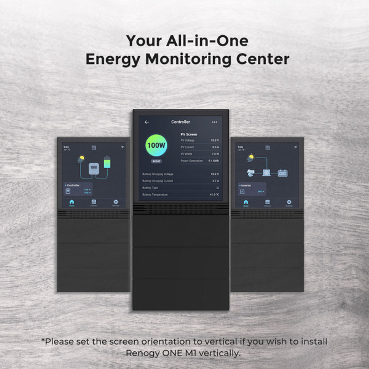 - All-in-One Smart Panel: Renogy ONE M1 is the nerve center of your off-grid home or RV. The 4-inch touch screen display provides smart energy monitoring and control of all your connected devices and appliances with intuitive visuals and real-time data.