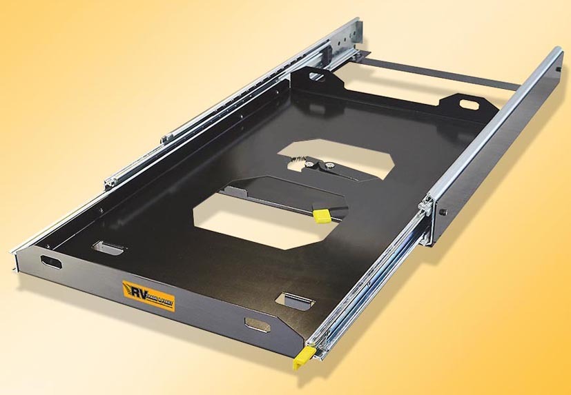 RV Storage Solutions universal Fridge Slide to suit Portable Fridges: up to 50L; Waeco, Engel, Bushman, and ARB 35 & 47L, 1 Year Warranty. The unique Travel Lock mechanism prevents any slide tray movement during rough travel which can cause damage to the slide runner’s built in lock-in, lock-out mechanism. This makes RV Storage Solutions fridge slides virtually bullet proof. Rated at a high 250kg capacity of evenly distributed weight, they offer full extension, suiting a variety of uses. These high quality heavy duty units come with a full 1 year warranty.