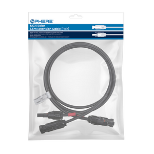Sphere Solar 1.5m Extension Cable, Pair, 1 Year Warranty. Compact, reliable and ready to install, the SPHERE 1.5m MC4 extension pair is ideal for bridging short gaps between solar panels or charge controllers. Each cable is made from durable 4mm² twin double-insulated solar wire, pre-fitted with waterproof MC4 connectors for a clean, tool-free connection.