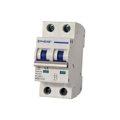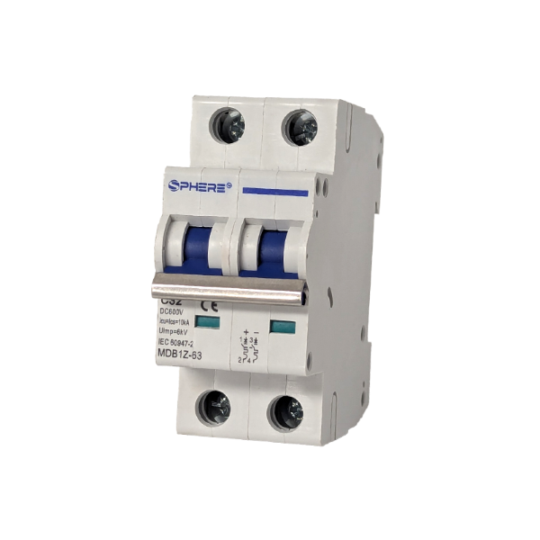Sphere 2 Pole Non Polarised DC Circuit Breaker, 50A, 1 Year Warranty. Designed to handle up to 600V DC, these non-polarised breakers can be installed in either direction, making setup simple and reducing the risk of wiring errors. The robust dual-pole design offers balanced circuit control, while the DIN rail mounting system allows for fast, tidy installation inside distribution panels.