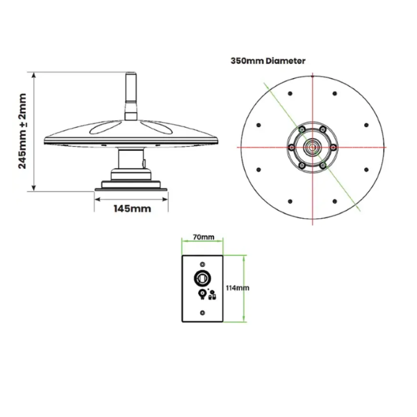 - Mounting: Roof mount with included screws and gasket