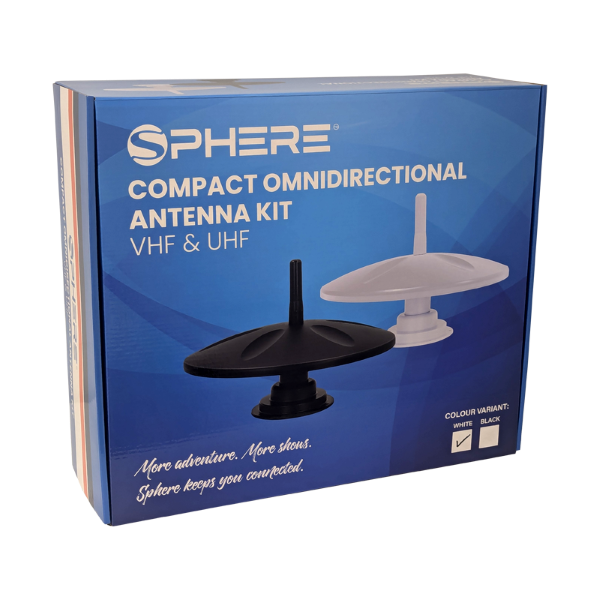SPHERE Compact 12V Omnidirectional White Antenna Kit,1 Year Warranty. Enhance your RV entertainment experience with this compact omnidirectional TV antenna, designed specifically for modern Australian RVs with limited roof space. Enjoy your favourite shows wherever your journey takes you — without complicated setup or constant adjustments.