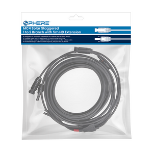 Sphere Solar Staggered 1 to 2 Branch with 5m HD Extension, 1 Year Warranty. Designed for seamless solar integration, this SPHERE 1-to-2 staggered branch lead simplifies multi-panel setups by eliminating excess cable length and reducing the need for additional connectors. Each branch is staggered to prevent bunching, while the 6mm² main output cable provides greater current capacity for stable power delivery.
