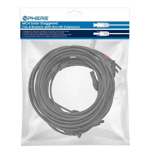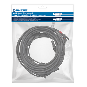 Sphere Solar Staggered 1 to 4 Branch with 5m HD Extension, 1 Year Warranty. Engineered for high-output solar systems, the SPHERE 1-to-4 branch lead connects up to four panels to a single circuit with balanced, efficient power delivery. The staggered input lengths ensure clean routing and reduced bulk inside your array, while the 6mm² main line carries high current with minimal voltage drop.