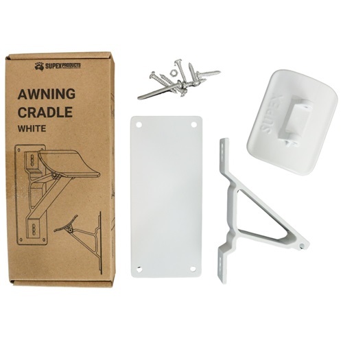 Supex White Awning Centre Support Cradle, 1 Year Warranty. Supports the centre weight of any roll out awning whilst travelling, preventing natural sag and keeping your whole awning secure. Designed to pivot to receive and release the awning roll when it is operated. Available in black or white powder coated finish to suit your van style.