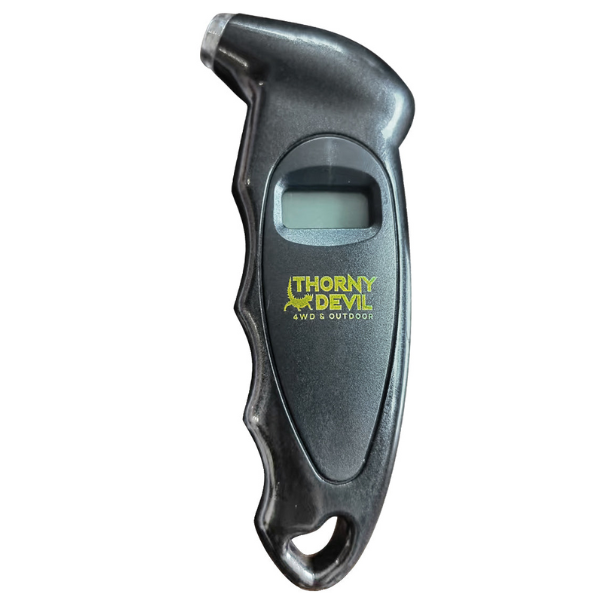 Thorny Devil Premium Tyre Deflator and Digital Gauge, 1 Year Warranty. Quickly and accurately deflate your tyres with this premium off-road kit. Includes 4 pre-set deflators (10–30 PSI), a digital pressure gauge (0–150 PSI) with backlit display, multiple unit readings, built-in lights, and auto shut-off — all packed in a durable storage pouch. Perfect for 4WD adventures.