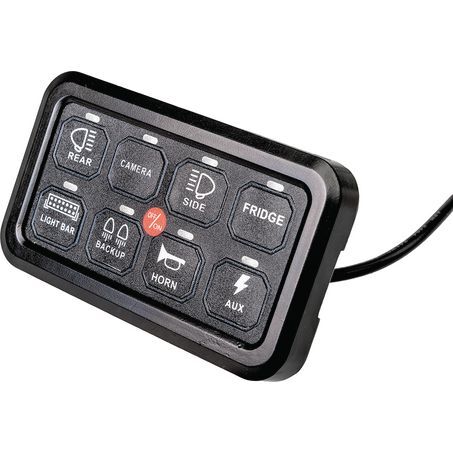 - Kit includes: Switch control box, 8 Gang switch panel, Bracket, Wiring harness, Strapping band, Voltage Protection 80A switch, Self-adhesive decal labels
