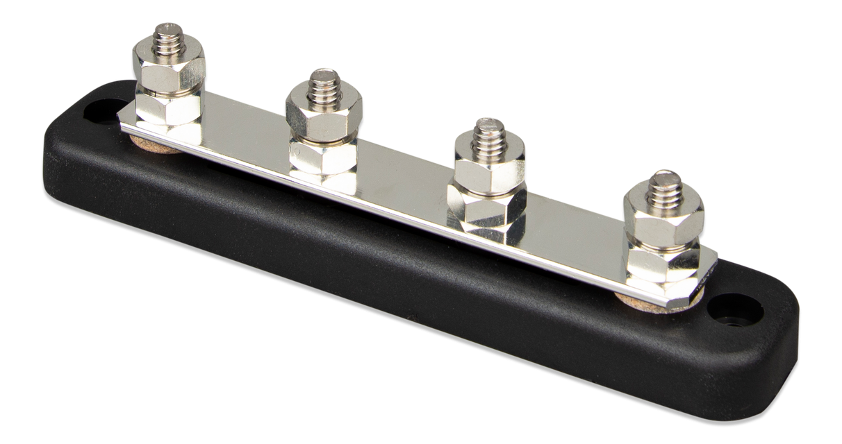 Victron Busbar 150A 4Pole & Cover, 5 Year Warranty. Busbars are used for high current distribution and at the same time they provide connections for batteries and/or DC equipment. We offer a number of busbars with different current ratings, and a different number of connection terminals. Each busbar is fitted out with a removable protection cover.