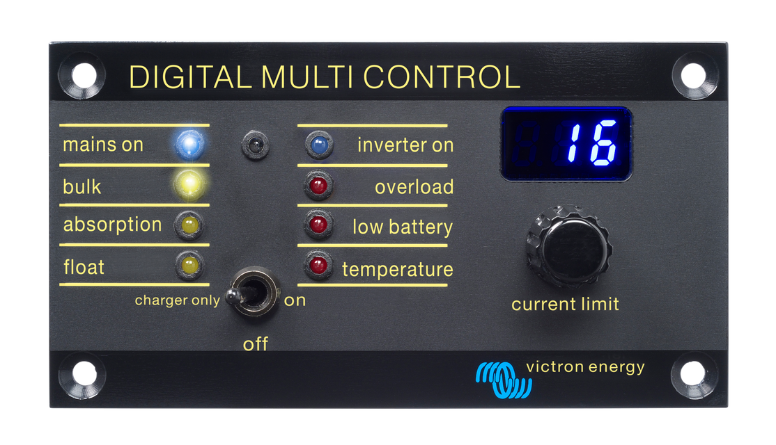 Victron Digital Multi Control 200/200A, 5 Year Warranty. This panel is intended both for Multis and Quattros. It allows PowerControl and PowerAssist current limit setting for two AC sources: a generator and shore side current for example. Setting range: up to 200 Amps. The brightness of the LEDs is automatically reduced during night time.