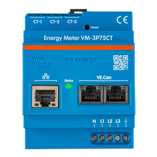 Three-phase energy meter with Ethernet and VE.Can communication ports. The Victron VM-3P75CT energy meter is a standard device to measure the power and energy of single- and three-phase applications, for example, at the distribution box or to measure the output of a PV Inverter, AC Genset or the output of an inverter and inverter/charger.