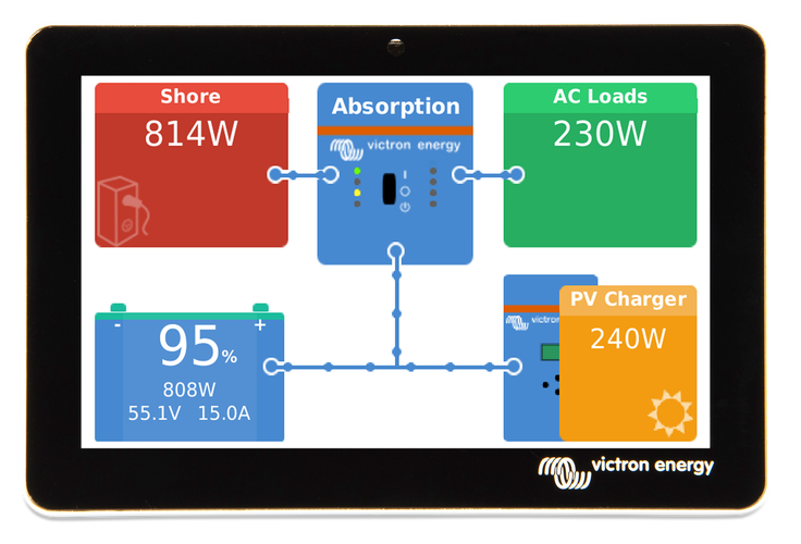 The GX Touch 50 is a companion to the Cerbo GX, the all-new communication-centre allows you to always have perfect control over your system from wherever you are and maximises its performance. Simply connect through our Victron Remote Management (VRM) portal, or access directly, using the GX Touch 50, an MFD, or our VictronConnect app thanks to its added Bluetooth capability. This latest addition to the GX-range combines all the best of connectivity, redefining smart power solutions in every way