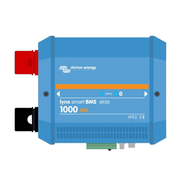 Victron Lynx Smart BMS 1000 NG (M10), 5 Year Warranty. The Lynx Smart BMS NG is a dedicated Battery Management System for Victron Lithium NG (not to be confused with the Lynx Smart BMS 500A, which is for Victron Smart Lithium batteries) batteries available with a nominal voltage of 12.8V, 25.6V and 51.2V in various capacities. This is the safest of the mainstream lithium battery types. The maximum number of batteries in one system is 50, which results in a maximum energy storage of 192kWh in a 12V system and up to 384kWh in a 24V and 48V system. The maximum energy storage capacity can be multiplied by paralleling multiple Lynx Smart BMSs, which also ensures redundancy should one battery bank fail.